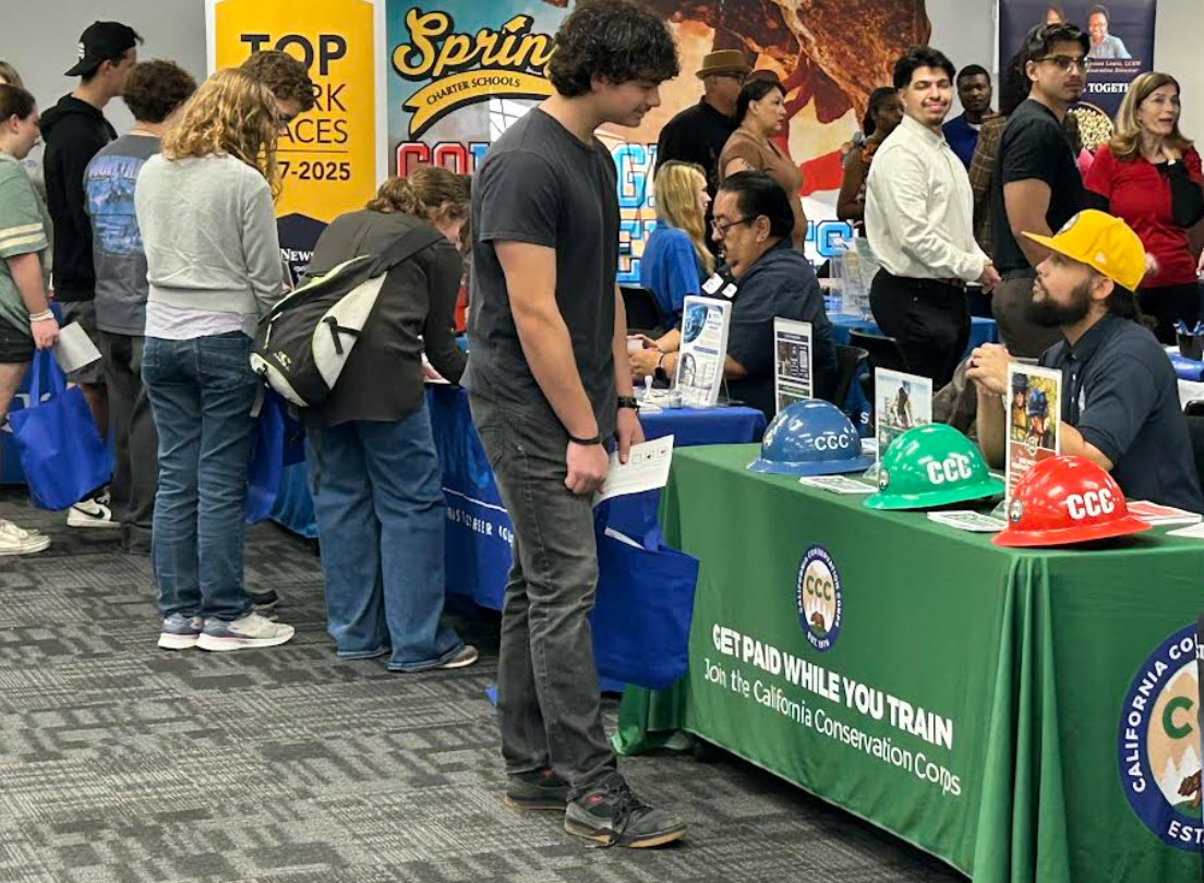 A student at Springs Charter Schools, a tuition-free public charter school, connects with career representatives during a school-hosted career fair. Events like these provide students with exposure to workforce pathways, training programs, and real-world opportunities that support college and career readiness.
