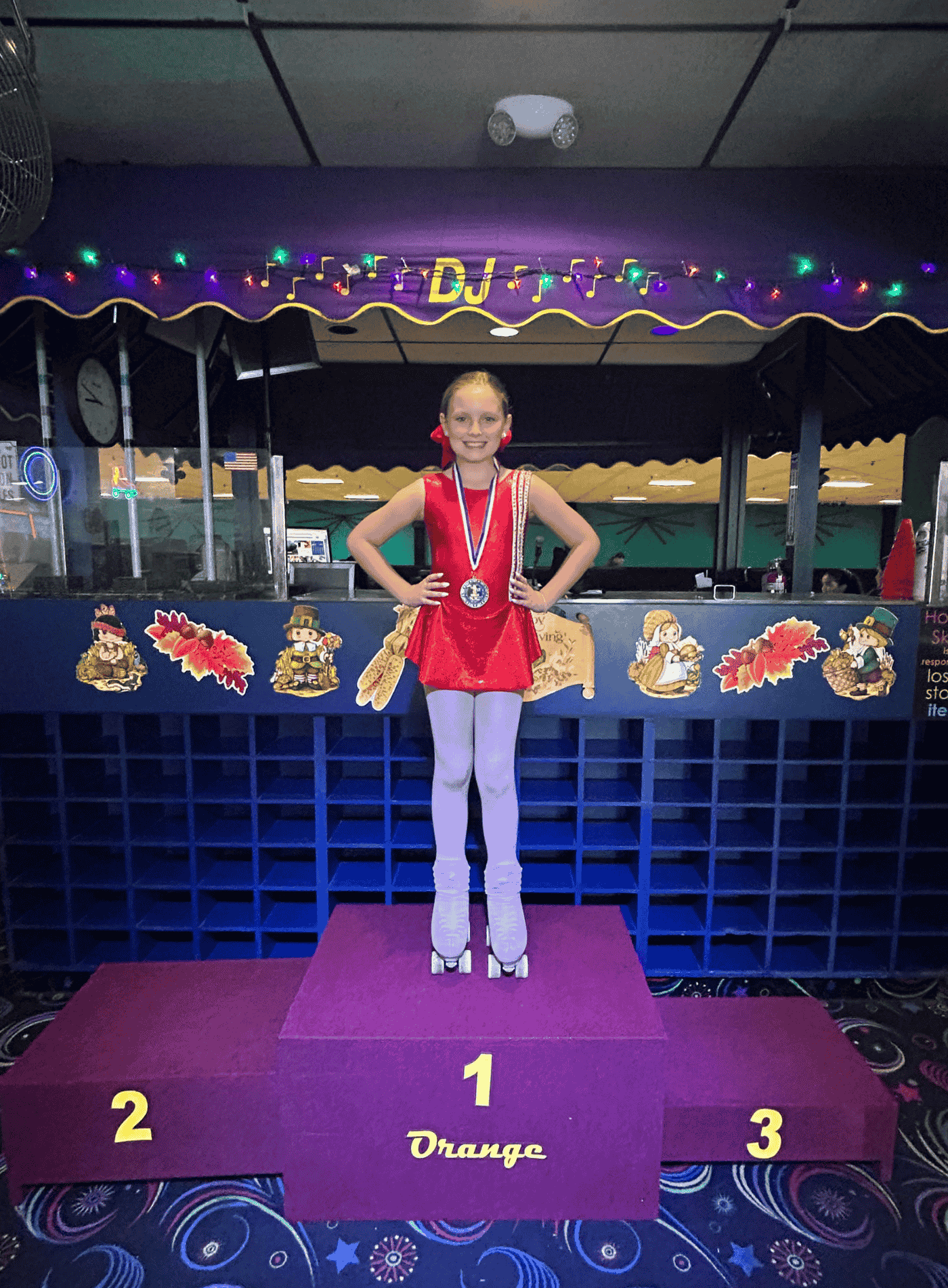 A Springs Charter Schools student proudly stands on a first-place podium wearing roller skates, a medal, and a red performance outfit. The image captures confidence, dedication, and the celebration of student achievement through extracurricular pursuits.