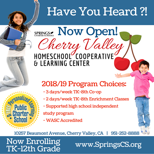Springs Charter Schools has added a 2 days/week TK-8th enrichment classes to its programming for the 2018-19 school year offered at the Cherry Valley Homeschool Cooperative & Learning Center.