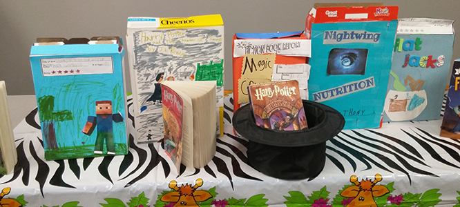 Students brought cereal box book reports to share, had the opportunity to interact with friends and read books such as The Rainbow Fish, The Little Red Hen, and The Jungle Book.