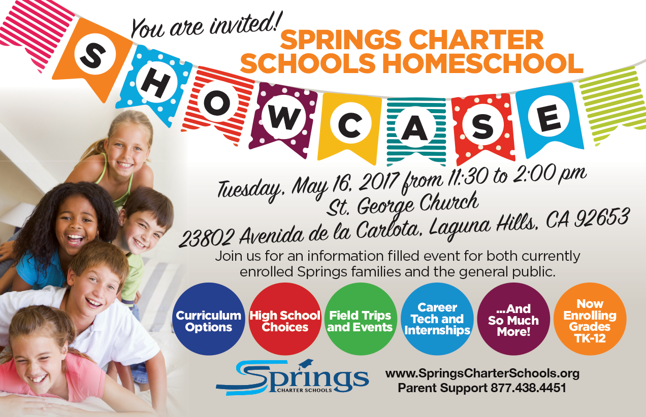 You are invited to the Springs Charter Schools Homeschool Showcase on Tuesday, May 16, 2017, from 11:30 a.m. to 2:00 p.m. 23802 Avenida de la Carlota, Laguna Hills.