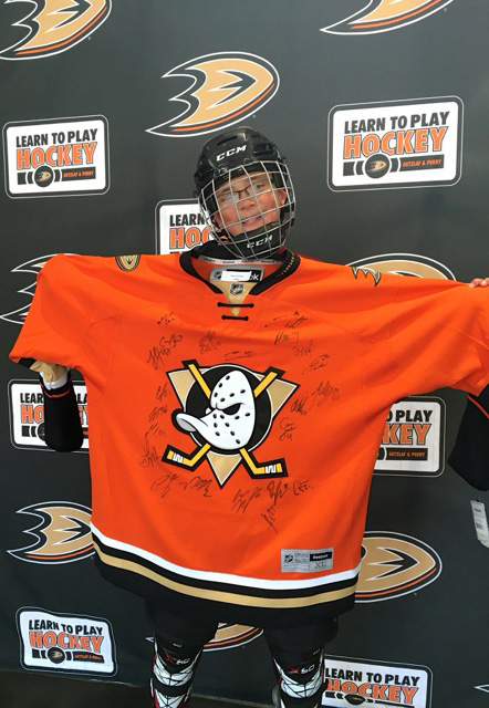 Homeschool student Caleb Miller participated in The Rinks Anaheim Ice’s Homeschool Ice Hockey Day and took home the grand prize drawing of a 2016 team-autographed Ducks jersey.