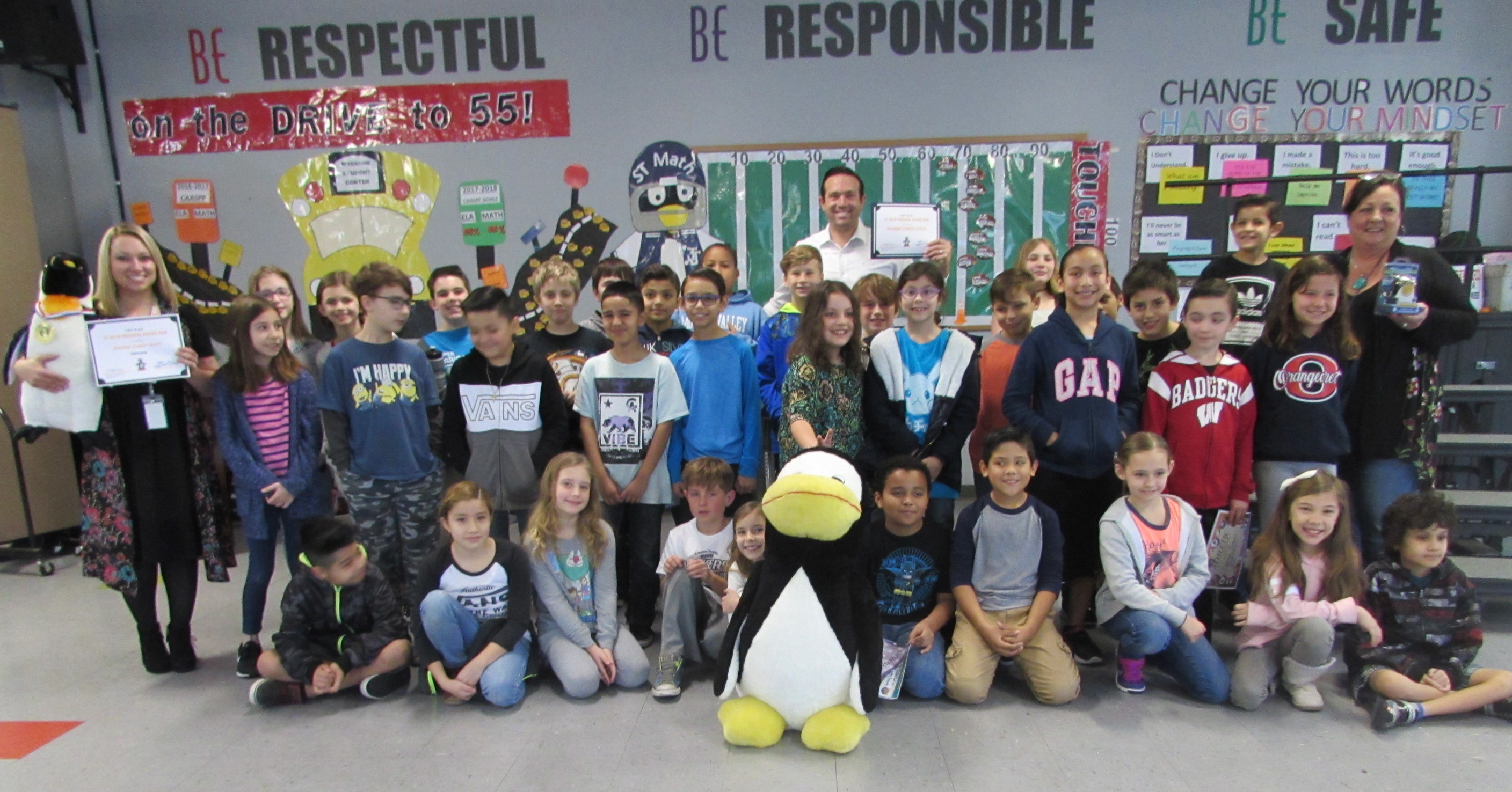 The Center’s Mosaic Academy students, he said, have been working hard this year towards the site goal of 100% completion of the program by every student K-8. Throughout the year, the Center has had a friendly class competition throughout the school. Mr. McLeod explained, “Classes are tracked on our giant football field and they move down the field towards the 100% touchdown marker. Classes are also rewarded in the form of a giant 4-foot tall Jiji penguin from the program for being the top class. Top students are given cones to place on their desks as a symbol to classmates of their progress …”