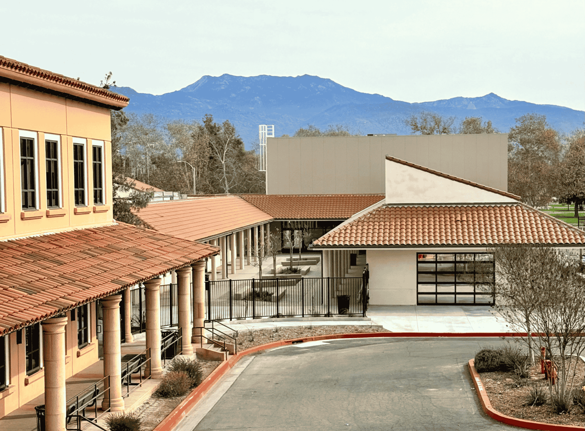 A scenic exterior view of a Springs Charter Schools campus, a tuition-free public charter school, featuring Spanish-style architecture with red tile roofs and a mountain backdrop. The image highlights the welcoming campus environment and thoughtfully designed school facilities that support student learning and community connection.
