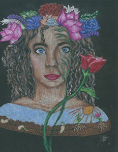 Her favorite art mediums are colored pencils. She likes to draw people and things in nature. In addition to art, she likes to sing, act and participate in musical theater productions. She also competes with the Riverside Aquettes, a local synchronized swimming team.