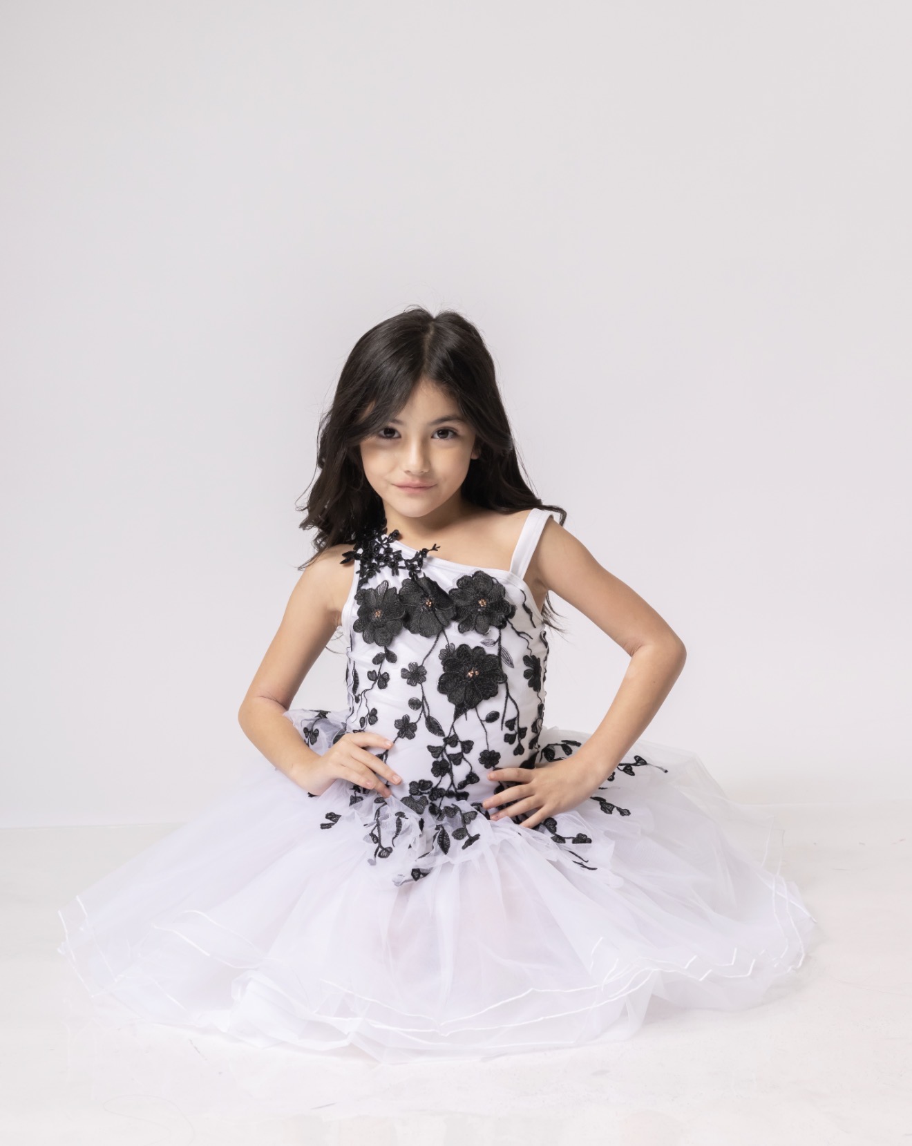 A studio-style portrait of a young student wearing a white dress with black floral appliqué details. She poses confidently with hands on her hips against a clean, neutral background. The image highlights poise, confidence, and a polished presentation, suitable for performances, portraits, or special events.