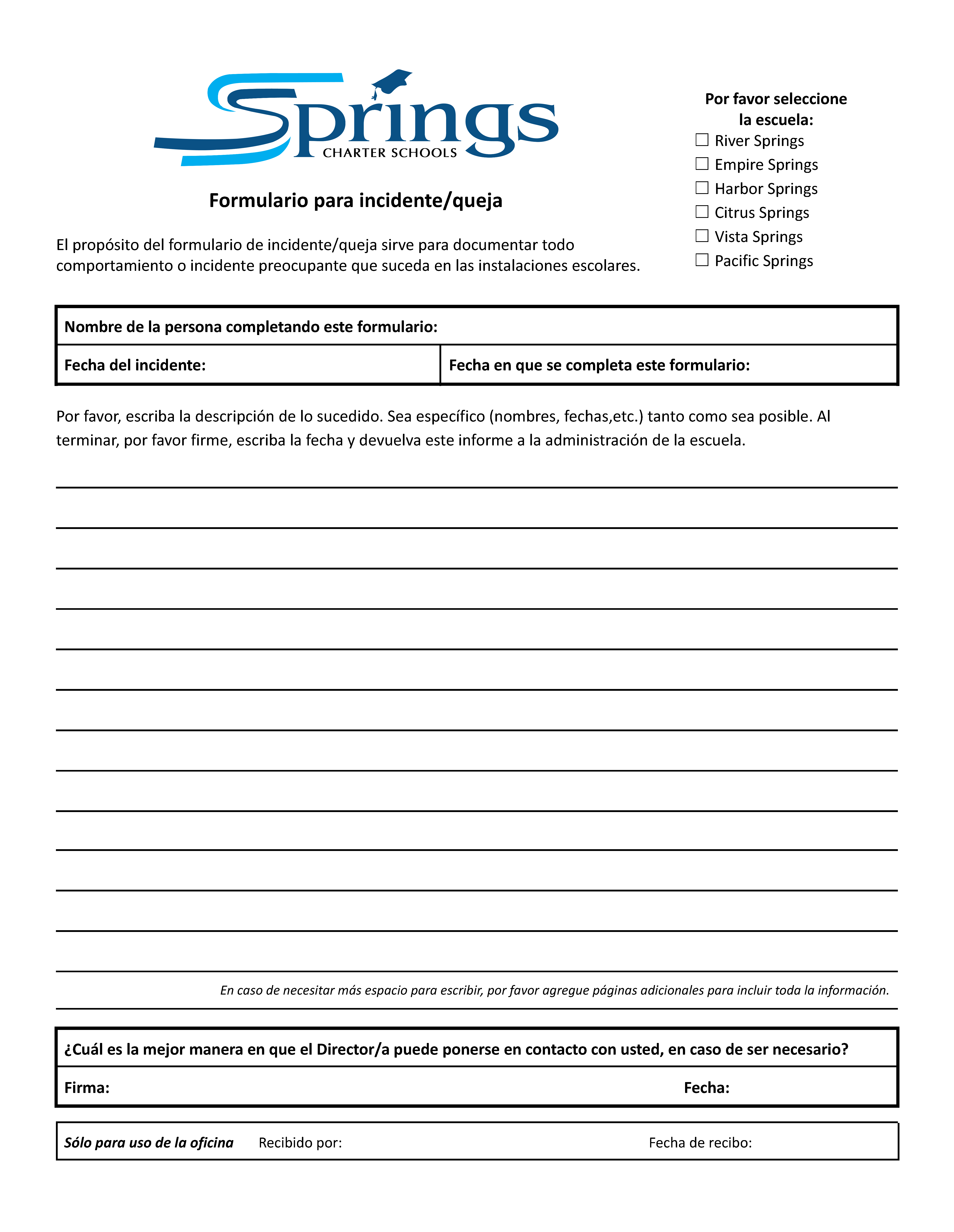 El propósito del formulario de incidente/queja sirve para documentar todo comportamiento o incidente preocupante que suceda en las instalaciones escolares.