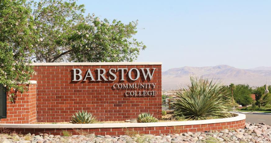 A brick sign for Barstow Community College surrounded by desert landscaping with mountains visible in the background.