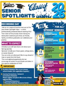 We’re thrilled to invite your senior to participate in Senior Spotlight Filming, taking place at campuses throughout our region January 12–14! While participation is optional, we highly encourage every senior to join in this meaningful milestone experience and keepsake opportunity.