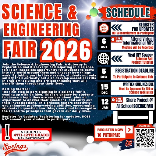 This eye-catching flyer promotes the 2026 Science & Engineering Fair for Springs Charter Schools students in grades 4–12. The flyer outlines important dates, including a virtual informational meeting on November 6, a registration deadline of December 5, and project submission for the All School Science Fair on January 12. Students are encouraged to ask meaningful questions, develop innovative experiments, and explore how science and engineering affect the world around them. The flyer includes a QR code for registration, contact info, and details on project outlines and tutorials to guide participants through the process.